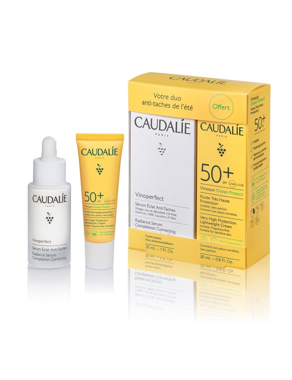 ¡Proporciona a tu piel un bronceado sin manchas, luminoso y duradero con el Cofre Dúo Antimanchas del Verano de Caudalie! El Sérum Resplandor Antimanchas Vinoperfect 30 mL corrige las manchas y previene su aparición. La nueva Crema de Alta Protección SPF50 Vinosun Protect 25 mL de regalo protege eficazmente el rostro y el cuello de los rayos UVA/UVB y aporta a la vez una acción antioxidante a las pieles más sensibles. Invisible, "clean" y con una delicada nota de perfume estival.
