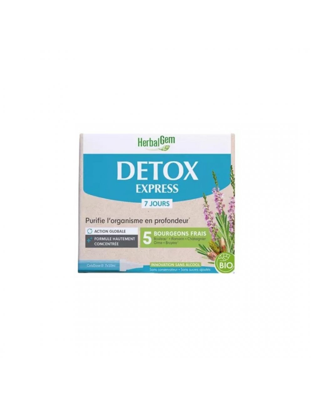 HerbalGem Detox Express 7 Monodosis es un complemento alimenticio a base de brotes frescos de abedul, romero, castaño, olmo y brezo, para depurar profundamente el organismo.