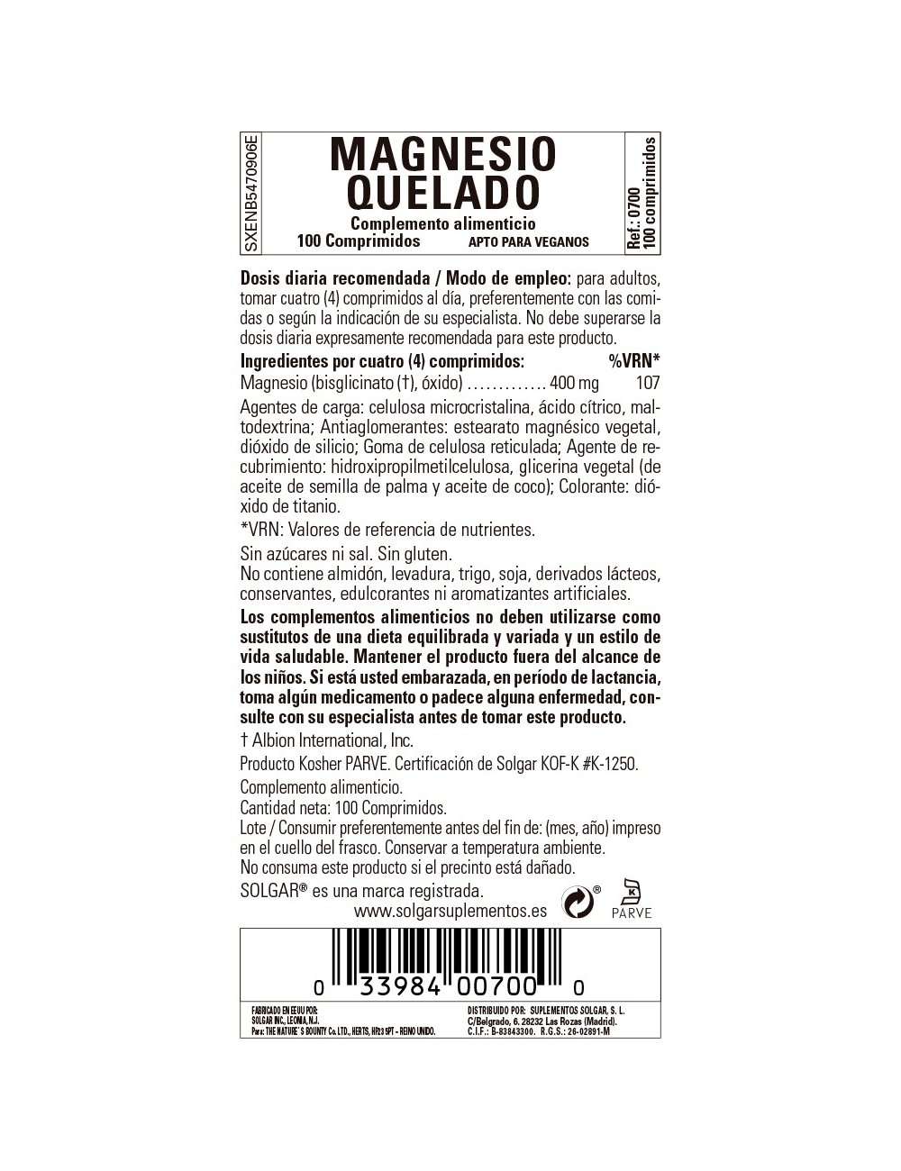 Solgar magnesio quelado 100 comprimidos.